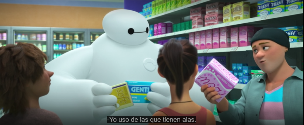 Entre estos personajes hay un hombre que le recomienda a Baymax las toallas con alas ya que esas son las que él usa.  De esta manera tan sencilla la serie muestra que también hay hombres que menstrúan, una realidad que hasta ahora ninguna serie familiar se ha atrevido a tocar.