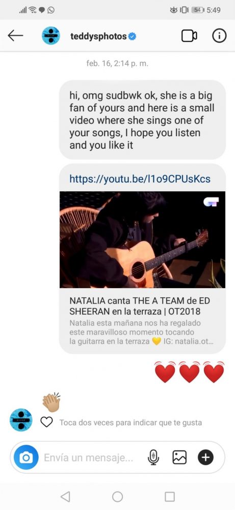 Unos meses después de que ocurriese esto, y en plena Gira de OT, una de las fans de la cantante ha querido probar suerte, mediante Instagram y contactar con Ed Sheeran. «Quien la sigue la consigue» dicen y, sin duda, así ha sido. Aquí os dejamos con la conversación: