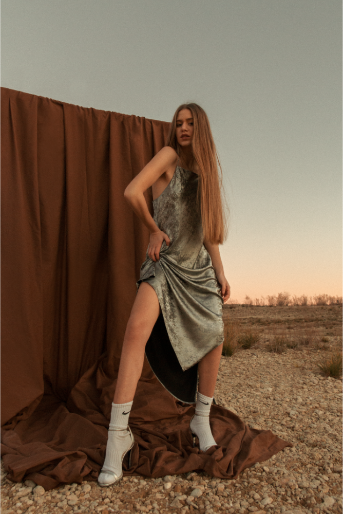 Violeta Toloba lleva vestido de Zara, calcetines Nike, tacones de Stella McCartney y joyas de la modelo.