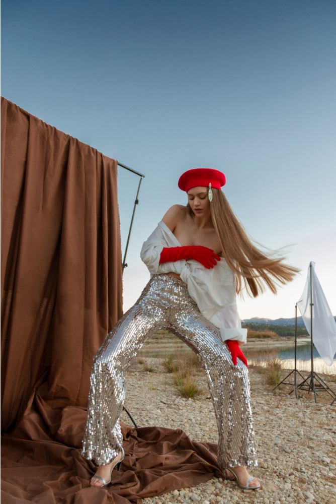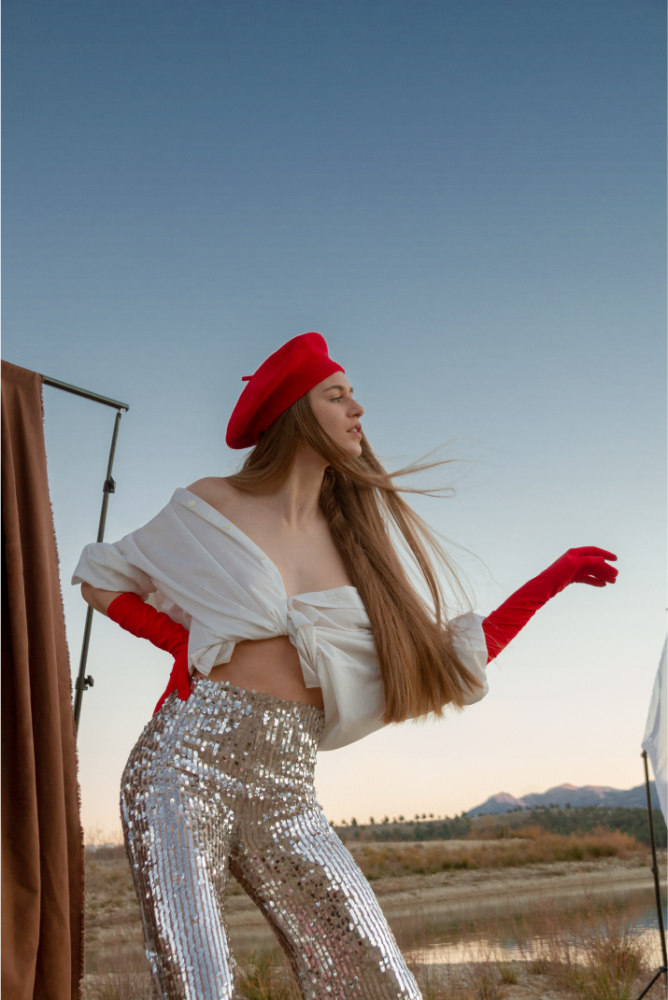 Violeta Toloba lleva camiseta de Bimba&Lola, pantalones de Zara, gorro y guantes de Lack Of Color y tacones de Stella McCartney.