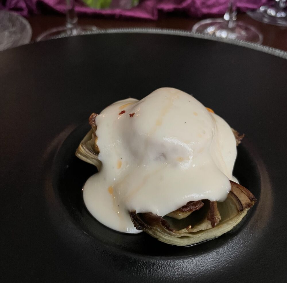 En segundo lugar, tocaba la ENVIDIA: alcachofa asada, espuma caliente de chirivía y vainilla con vieira y aceite de carabinero. Este es el plato que compite con el anterior en posicionarse como mi favorito. La salsa que acompañaba las alcachofas y las vieiras era una pasada, con un sabor muy especial y umami.