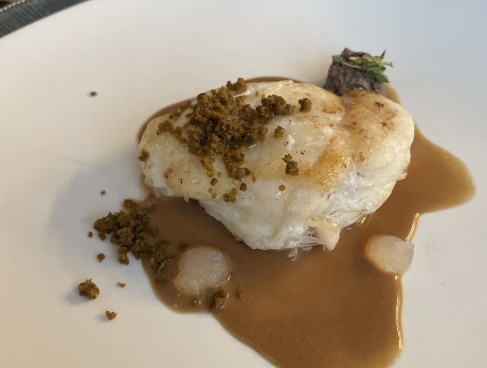 Venía el cuarto plato y, de aquí en adelante, lamentablemente, el nivel fue bajando. Seguíamos con la LUJURIA: Rape asado, aceituna y escabeche templado. Este plato era de los que más ganas tenía de probar cuando leí el menú porque me gusta mucho el pescado, especialmente el rape, y porque es difícil comer buen género en casa, sin embargo, me decepcionó profundamente. No solo no sabía demasiado a aceituna, un sabor que al principio gusta y sorprende, y más si te gusta la aceituna como a mí, pero que terminó siendo repetitivo. Por otro lado, el rape no era un rape de calidad, no estaba lo tierno y suelto por dentro que debería haber estado.