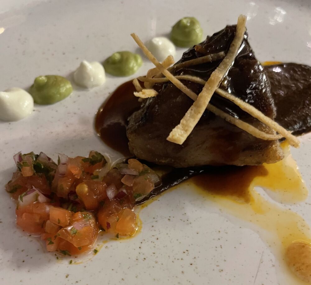 Llegábamos prácticamente al final de la noche y nos presentaban la SOBERBIA: Lomo de cerdo de bellota, mole, pico de gallo, guaca-humo y suero costeño. Por lo que nos contaba el chef, este plato viene inspirado por su experiencia en México, donde estuvo trabajando unos años además de en otros países, pero en mi opinión la carne y la salsa de carne que la bañaba no combinaba del todo con el pico de gallo y el guacamole y suero costeño. Parecía que México estaba metido con calzador en este plato. Disfruté mucho la carne, porque era muy buena carne, estaba al punto perfecto y se deshacía prácticamente en la boca, pero la combinación con el resto de elementos no me encajaba.