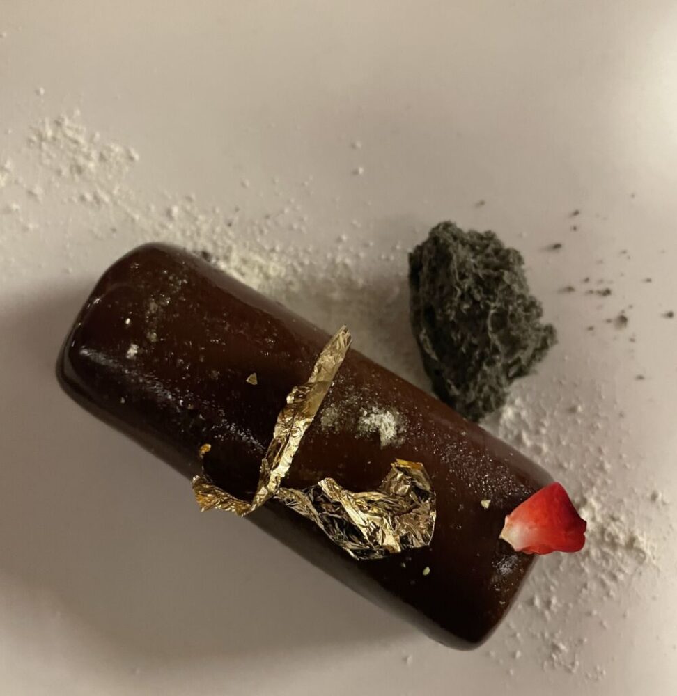 Llegaba el final. Poníamos el broche de oro con GULA: Lingote de chocolate y wasabi. Sabéis que no soy el mayor fan del dulce ni de los postres, que siempre es mi parte menos favorita de las comidas, y es que este postre en especial me resultó muy dulce y empalagoso. Quizás sea yo que los dulces no son mi punto fuerte.