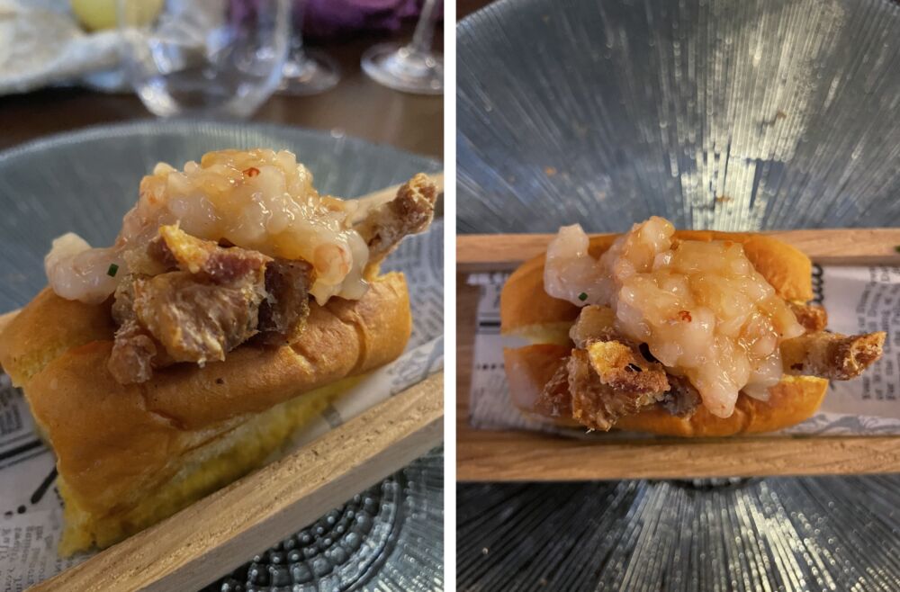 Con el siguiente plato, remontábamos un poco la velada porque soy un auténtico amante de la oreja y de la casquería. Llegaba la PEREZA: Brioche de oreja, salsa brava con kimchi y tartar de gamba con aliño japonés. Me gustó más que el rape y más que lo que vendría después, pero me pareció un plato un tanto ostentoso por el tartar de gamba que coronaba el brioche ya que, con una buena oreja a la plancha, que estaba realmente buena y muy crujiente, no hace falta poner más elementos, y más cuando no combinan del todo.