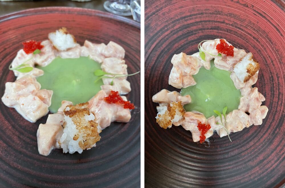 Comenzábamos el menú con el primer plato, la IRA: Tartar de salmón con salsa cremosa de jalapeños y algas, pero no era un tartar al uso, se trataba del salmón rodeando la crema de jalapeño, finalizado con crispy rice que aportaba ese crunchy al plato que hizo que se convirtiera en, probablemente, mi plato favorito del menú.
