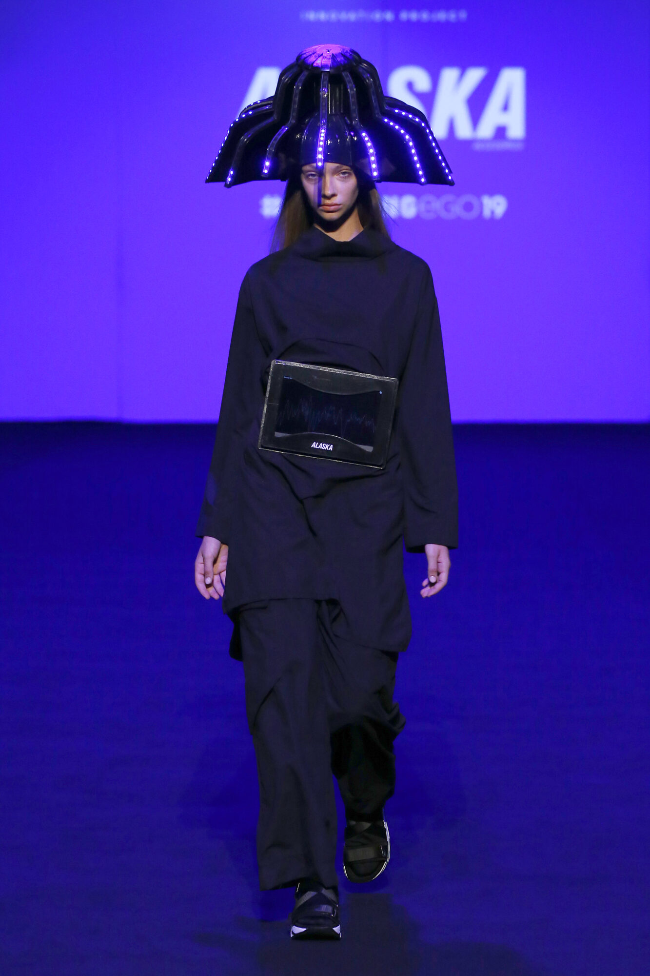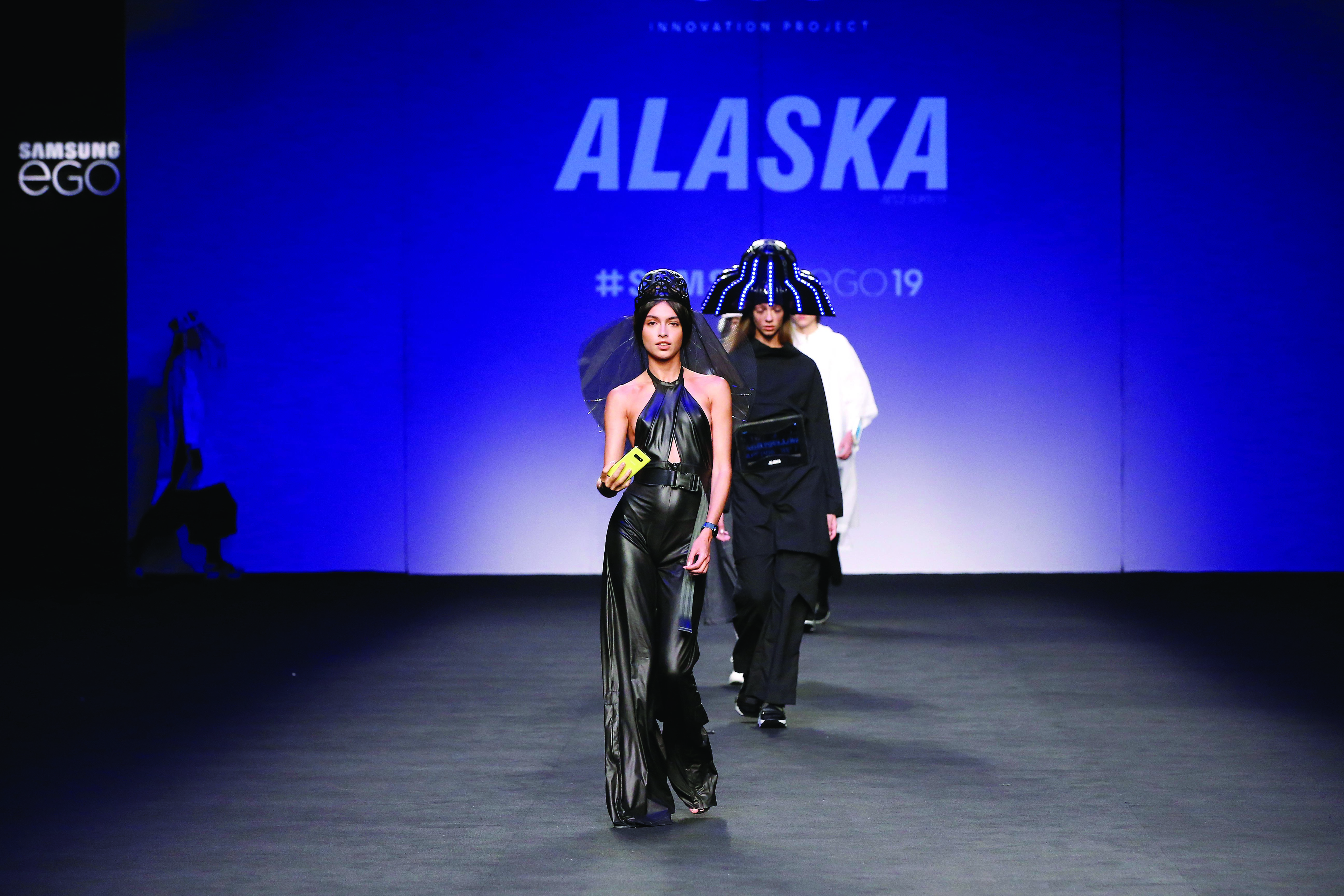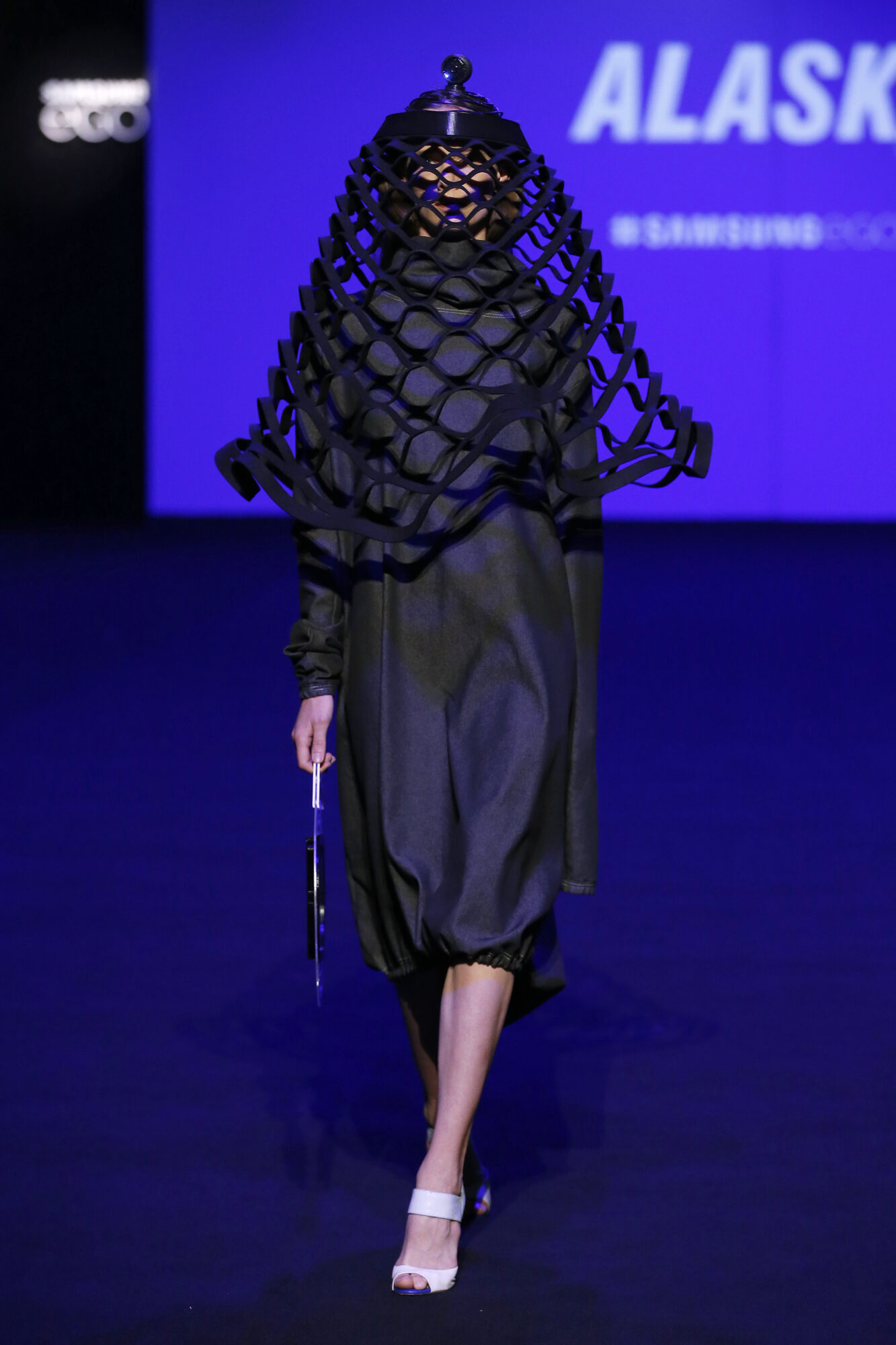 La encargada de abrir la jornada fue ALASKA accesorios, ganadora de la décimo segunda convocatoria de Samsung EGO. Su colección estaba repleta de diferentes accesorios sobre todo complementos para la cabeza. Mezclaban luces de neón que se activaban mediante tecnología de Samsung. Sin duda alguna un espectáculo de luces y tecnología.