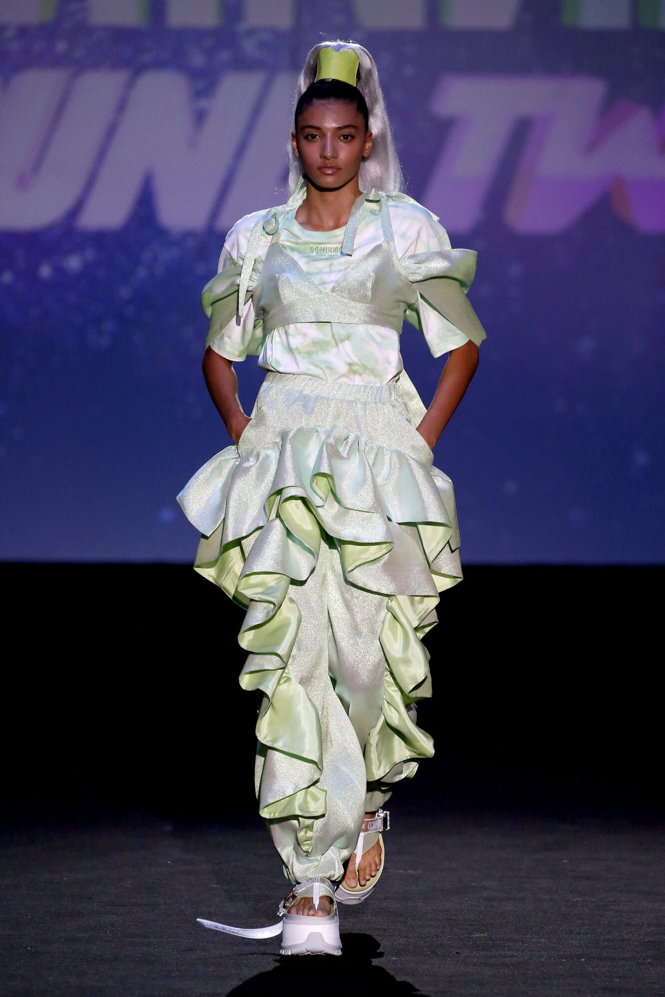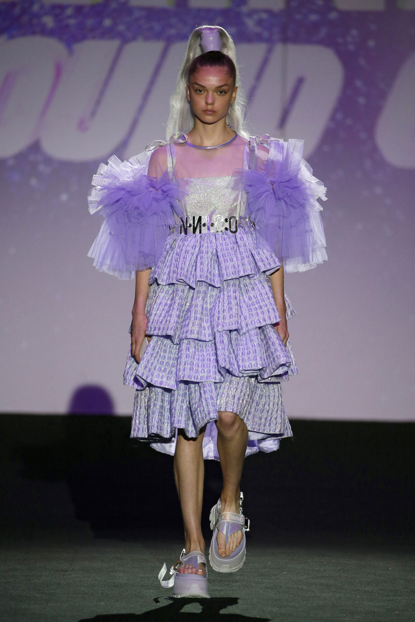 Becomely apuesta por el reciclaje en su colección para Samsung EGO, ya que se basa en tejidos de diferentes grandes almacenes de Europa y complementos en 3D. Un desfile lleno de colores infantiles y con estilo vintage que nos dejó maravillados.