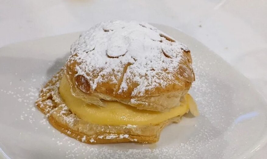 Una vez devorada la carne -que hasta el hueso aprovechamos porque se lo trajimos al perro-, nos aventuramos con un postre típico vasco llamado Pantxineta, hecho con hojaldre, crema y almendras laminadas. Creo que fue lo que menos me ilusionó de toda la comida, pero si te gusta la mezcla de esos tres elementos, seguro que te encantará.