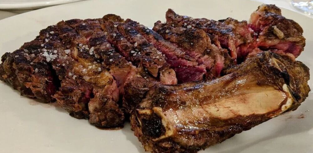 Y, por fin, llegó el plato fuerte. Un chuletón macerado de 1 kilo y 200 gramos de peso. Una de las mejores carnes que he probado, con un punto perfecto -que si a ti te parece demasiado crudo no hay problema en que te lo pasen más-, con la cantidad justa de grasa y con el perfecto toque de sal. Si quieres acompañantes para la carne, tienes la opción de pedir patatas fritas (8,95 la ración) o ensalada (8,90 la ración), pero hay que pagarlas aparte, el precio del chuletón tan solo implica el chuletón.